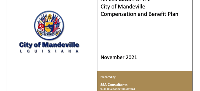MANDEVILLE — The long-awaited salary survey report, commissioned by the City of Mandeville in early 2021 was presented to the City Council tonight (November 18th) by representatives from SSA Consultants of Baton Rouge, the firm that conducted the survey.