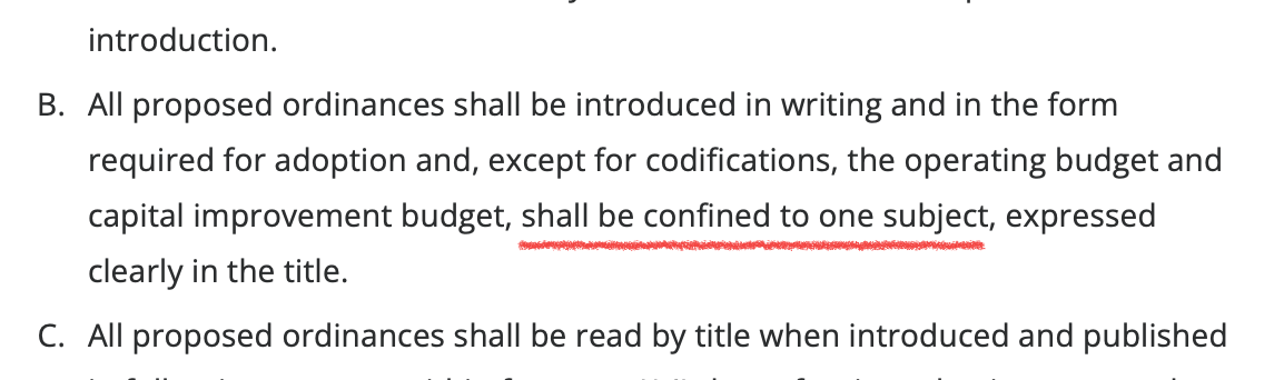 To make the argument that because Ordinance No. 22-03 handles “raises” and they were trying to give Scherer a “raise” doesn’t pass the smell test. If that were the case then we could just have one big ordinance each meeting to handle whatever needs to be done under the subject “the people’s business.”