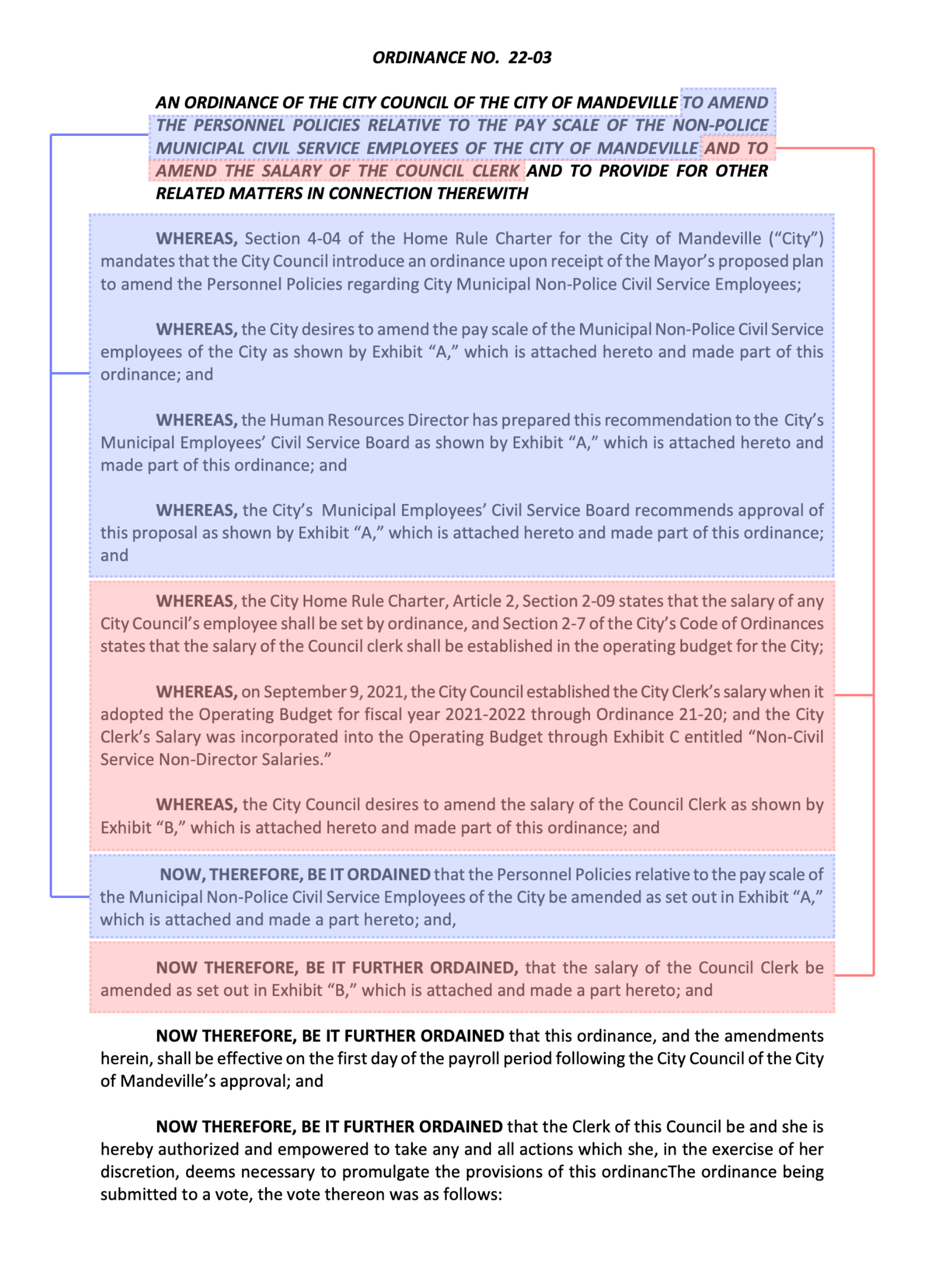 If you had read Ordinance No. 22-03 — for the civil service pay scale changes — you might not even have noticed that second primary clause wedged in there: “And to amend the salary of the council clerk.”