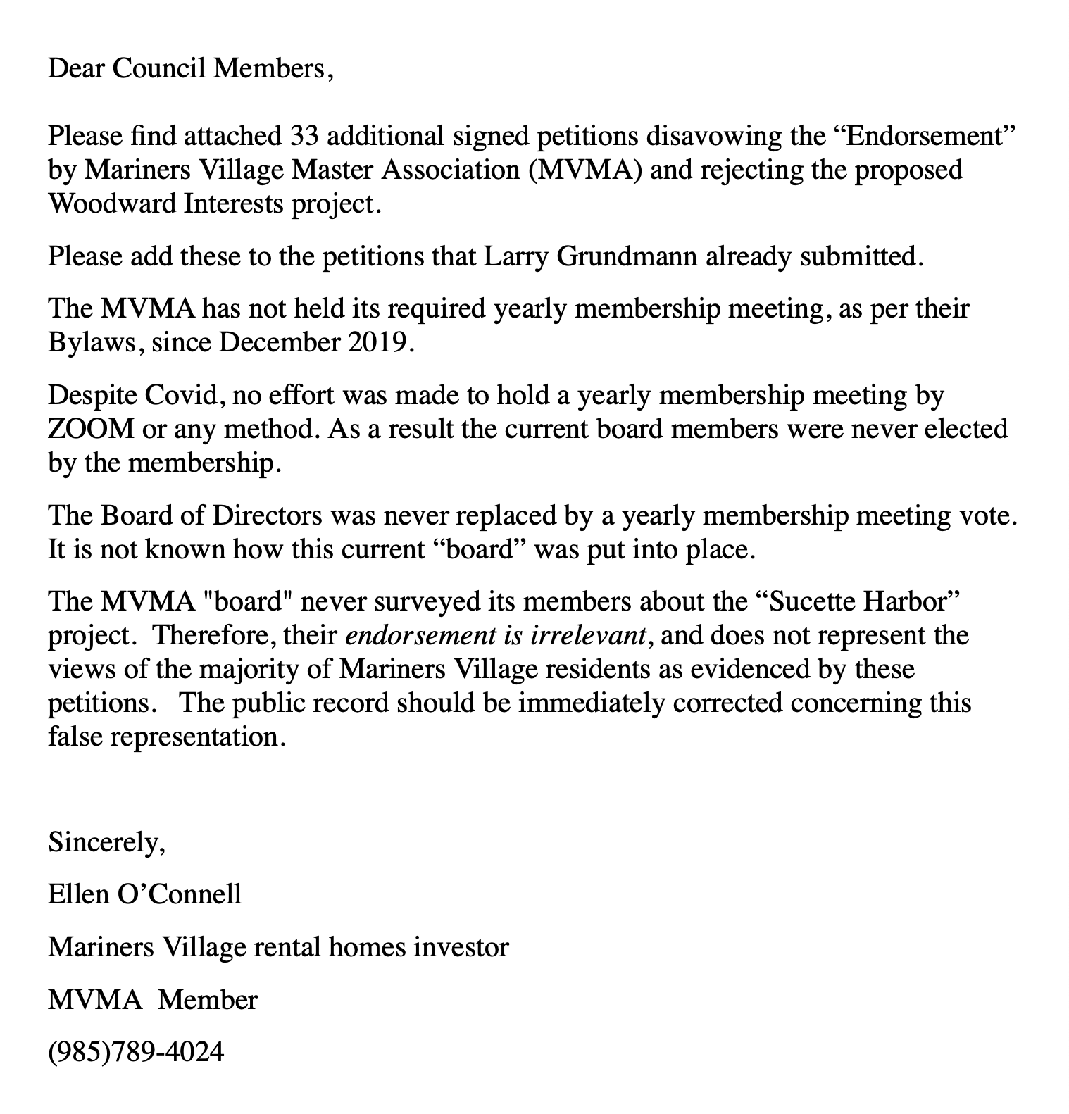 2 thoughts on “Mariner’s Village Sucette opposition list grows with more disavowals submitted to City Council”