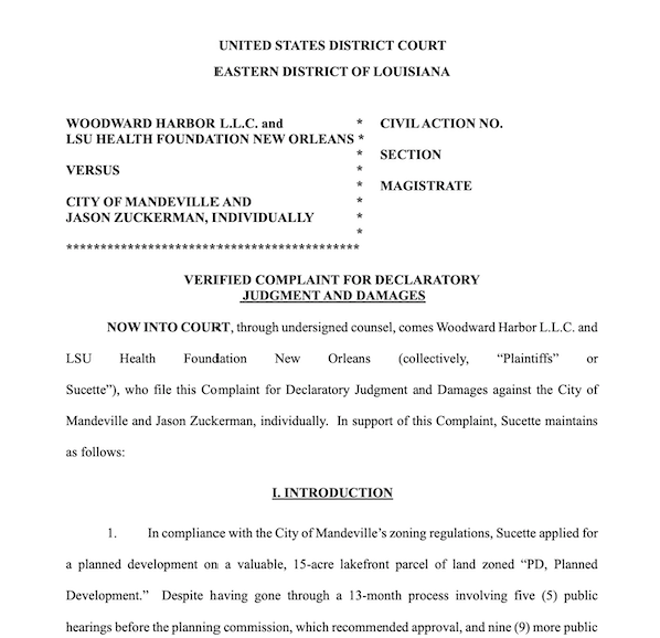 The lawsuit was filed with the United States District Court, Eastern District of Louisiana. Zuckerman is being sued individually in the civil suit. The suit asks the court to force the city to approve the Sucette Harbor project as it was recommended by the Planning and Zoning commission by a narrow 4-3 vote on April 17th, 2023. The City Council rejected Ordinance 23-16 in a 5-0 vote September 5th, 2023.