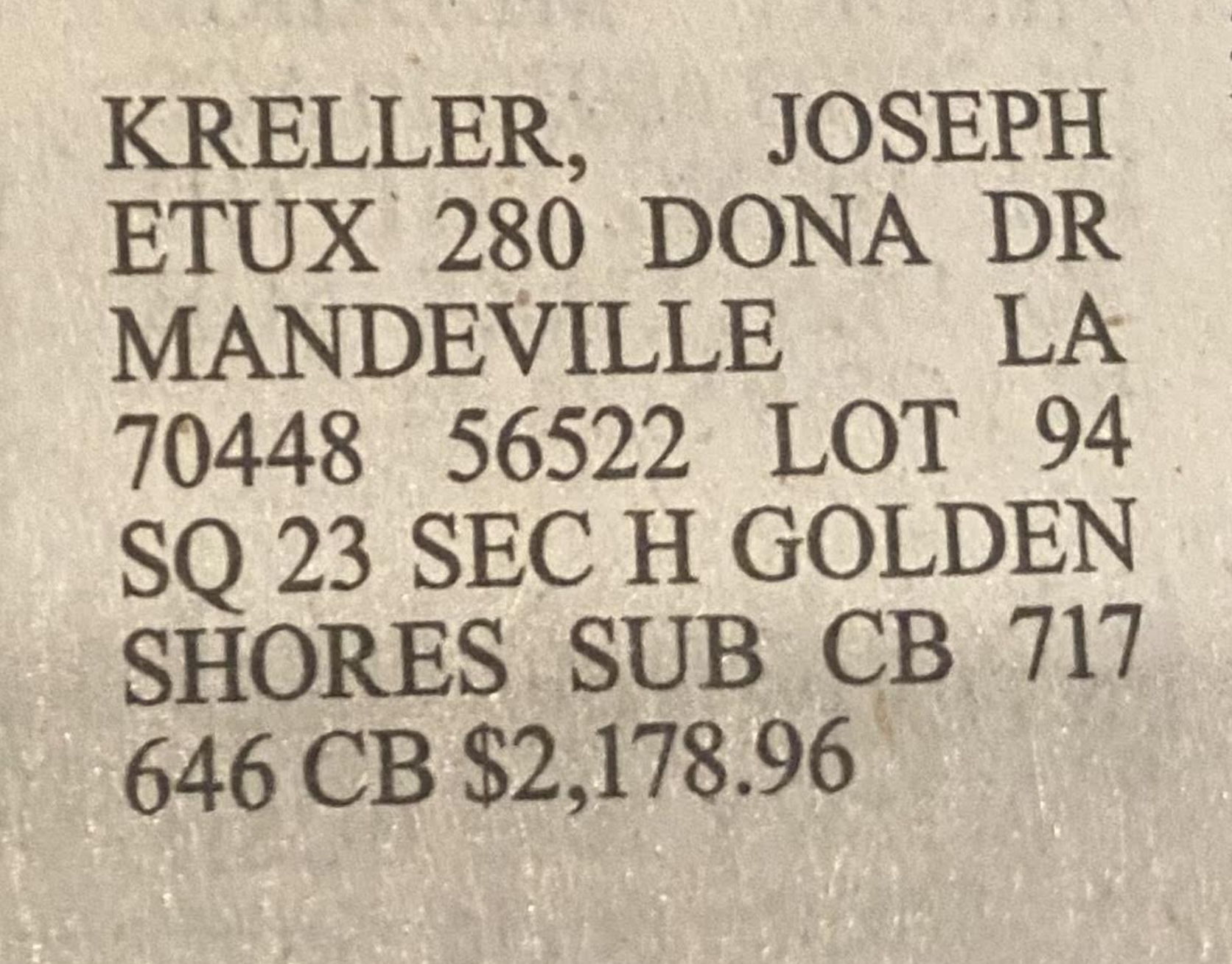 The St. Tammany Parish Sheriff’s Office’s June 7, 2023, delinquent property tax report — which is posted online and in local newspapers — contained a “Joseph Kreller” of 280 Dona Drive in Mandeville for $2,240.96. That debt was paid on June 12, 2023, according to the Sheriff’s Office tax collection division.